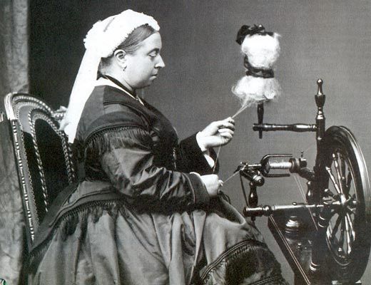 El arte de las spinsters, se hizo tan popular durante la época victoriana que hasta la mismísima Reina Victoria tenía su rueca particular y no dudaba en dejarse fotografiar llevando a cabo tan doméstica labor.